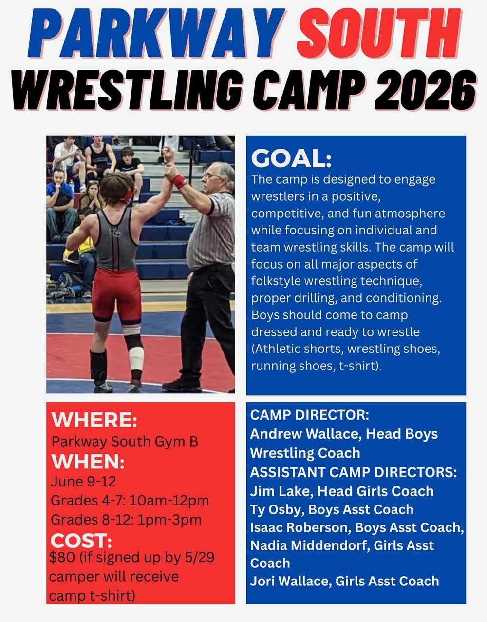The Parkway South Wrestling Camp offers a positive, competitive, and fun environment where wrestlers can improve their wrestling skills and build team camaraderie. The camp will focus on all major aspects of folkstyle wrestling, including technique, effective drilling, and conditioning. All wrestlers should arrive dressed and ready to participate, wearing athletic shorts, a t-shirt, wrestling shoes, and running shoes.